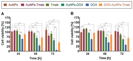 Metabolic activity of SKOV-3 (A) and MDA-MB-231 (B) cells after treatment with AuNPs, AuNPs–Tmab, Tmab, AuNPs–DOX, DOX, DOX–AuNPs–Tmab. The DOX concentration was 7 µg/mL. Cells were incubated for 24 h, 48 h, and 72 h and then the MTS assay was performed. Untreated cells were used as control (100% viability). Statistics were performed using a one-way ANOVA test comparing AuNPs together with NPs with DOX and/or Tmab attached, and AuNPs–Tmab was compared with Tmab/DOX–AuNPs–Tmab and AuNPs–DOX via DOX/DOX–AuNPs–Tmab. Summarized data represent results from four replicates (n = 4; mean ± SD) and were considered significant if p ≤ 0.01 (**), p ≤ 0.001 (***), or p ≤ 0.0001 (****).