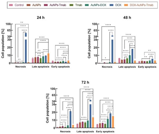 Distribution of SKOV-3 cell populations (necrosis, late and early apoptosis) treated with AuNPs, AuNPs–Tmab, Tmab, AuNPs–DOX, DOX, DOX–AuNPs–Tmab after 24 h, 48 h, and 72 h. The data presented are from four replicates (n = 4, mean ± SD). DOX concentration is 7 µg/mL. Untreated cells were used as control, while statistics (one-way ANOVA test) were performed similarly as in the case of the cytotoxicity studies with the use of the MTS assay (Figure 8). Statistical significance was considered significant if p ≤ 0.05 (*), p ≤ 0.01 (**), p ≤ 0.001 (***), or p ≤ 0.0001 (****).