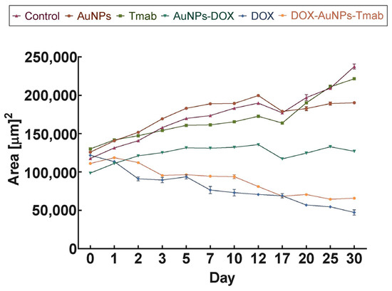 Microscopic images of the spheroids treated with the synthesized compounds and their measured areas for 30 days are presented in Figure 11 and Figure S5. Figure 12 clearly shows that unbound DOX and the bioconjugate exhibited a toxic effect. The surface area of spheroids treated with DOX–AuNPs–Tmab started to decrease after day 2, and after day 30 the area was reduced almost by half (day 0: 111 065 ± 310 µm2 vs. day 30: 65 763 ± 589 µm2). A similar, although slightly stronger effect, was achieved by DOX. Additionally, the spheroid exposed to the bioconjugate shrunk, while treatment with DOX promoted the decomposition of small cell compartments. In contrast to the bioconjugate, no changes in spheroids treated with AuNPs, Tmab, and AuNPs–DOX were observed, regardless of their initial size. Notably, the spheroids after the addition of AuNPs–DOX grew slightly (surface area on day 30 increased by only 30%), whereas untreated 3D cell culture models doubled their surface area. The obtained results were consistent with cytotoxicity studies (MTS/apoptosis assay) described in Section 2.4.