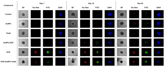 Representative fluorescence microscope images of SKOV-3 spheroids treated with AuNPs, Tmab, AuNPs–DOX, DOX, and DOX–AuNPs–Tmab or non-treated after 1, 10, and 20 days. The first columns (BF) are bright-field images, red signals (Tex Red) are from propidium iodide (PI), green is doxorubicin (FITC), and blue (DAPI) is Hoechst 33,258 staining.