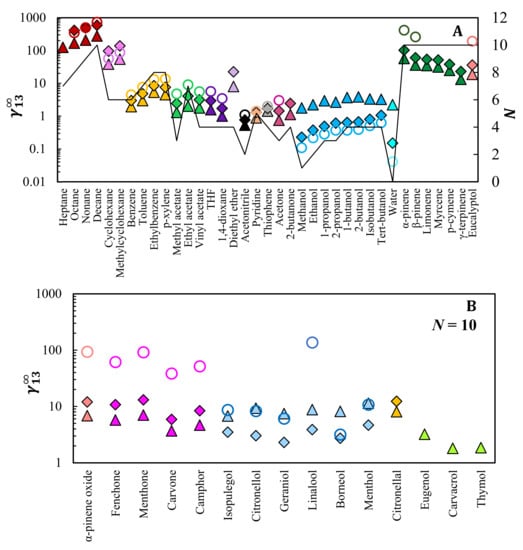 Figure 1 shows the experimental , measured at 353.2 K and 413.2 K. The highest temperature was selected for the less-volatile terpenoids (bottom panel). Due to the long retention times of the phenolic terpenoids (eugenol, carvacrol, and thymol) and the TCD detector sensitivity limit, these solutes were not analyzed in the equimolar mixture.