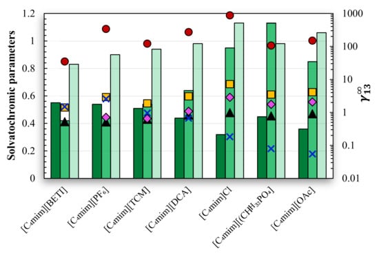 To further evaluate the effect of the anion polarity in the solute–solvent interactions, the activity coefficients at infinite dilution of diverse solutes in an extended group of ILs, composed of different anions and a common cation (1-butyl-3-methylimidazolium), were compared (Figure 2). Additionally, the ILs’ solvatochromic parameters (Table S4), hydrogen bond acidity (α), hydrogen bond basicity (β), and dipolarity/polarizability (π*) were introduced as a measure of polarity [38,39,40].