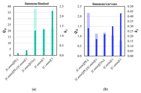 Hydrocarbon terpenes are known to act as impurities in some essential oils due to their low solubility in aqueous and alcoholic solutions, and due to the fact that these nonpolar fractions are more prone to oxidation processes. They can produce off-flavors that ultimately deteriorate the quality of the marketed EOs [49,50,51]. Thus, their removal (deterpenation) aims to separate the hydrocarbons from the oxygenated compounds, which are highly odoriferous and flavored [33]. In this scenario, the fractionation of the pair limonene/linalool, found in citrus EO [52,53], has been deeply investigated in the literature using ILs [11,12,16,18,25,34,35,54,55], due to the importance of this particular oil. Figure 3 shows that the highest capacity of linalool is observed in [C12mim]Cl, favored by the increase in the cation alkyl chain length. The pair limonene/carvone is representative of spearmint and caraway EOs, reaching up to 90% of the oil [56,57,58,59,60,61]. As shown in Figure 3, the best results for their separation were obtained with [C4mim][PF6].