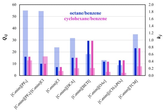 As shown in Figure 4, the highest solvent performance index is observed for the separation of octane and benzene using pure [C4mim][PF6] ( = 55.02), followed by its equimolar mixture with [C4mim]Cl. The value is slightly higher in [C4mim][PF6] than in the equimolar mixture, however, both are lower than the value reported with [C4mim][BETI] [41]. Analyzing the results for the cyclohexane/benzene pair, separation factors are, in general, low, with the equimolar mixture showing the highest solvent performance index value (16.17) among all the methylimidazolium-based ILs previously studied [11,16,17,21,27,41,42,72,73]. Making an overview of the results for all methylimidazolium-based ILs present in Table S11 and considering the previous information about the Kamlet–Taft β parameter [43,44] for the different anions, it seems that more polar anions tend to present lower solvent performance indexes (due to the low capacities) for the aromatic/aliphatic separation problems.