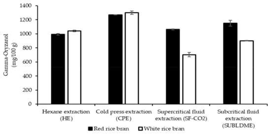 The γ-oryzanol content of the CRBO is based mainly on different extraction methods and the rice cultivars [90]. Pengkumsri et al. [61] also reported that the γ-oryzanol level of CRBO was high following the low color intensity the rice cultivar, in the order of brown, red, and black rice by HE, CPE, hot press, and SF-CO2 extraction. The γ-oryzanol content of the oil from white rice bran extracted by SUBLDME was high (1213.64 mg/100 g) compared with SF-CO2. The results were comparable to other reports by solvent extraction, cold-pressed extraction, and methanolic subcritical extraction of rice bran oil (1180, 1155, and 1212 mg/100 g, respectively) [91,92,93]. Patel and Naik [94] found γ-oryzanol at 1180 mg/100 g for a mixture of hexane and isopropanol extraction (60 °C) and 5100 mg/100 g for SF-CO2 (68.9 MPa at 50 °C). It is possible that the low γ-oryzanol level of the oil found in this study in comparison to Patel and Naik [94] is due to the lower pressure used for SF-CO2 (25 vs. 68.9 Mpa) for the same temperature (50 °C) and the different rice cultivar used.