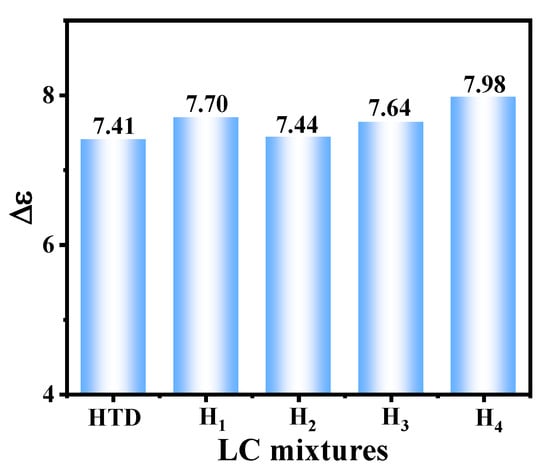 - Chen, H.; Liu, Y.; Chen, M.; Jiang, T.; Yang, Z.; Yang, H. Negative Dielectric Anisotropy Liquid Crystal with Improved Photo-Stability, Anti-Flicker, and Transmittance for 8K Display Applications. Molecules 2022, 27, 7150. [Google Scholar] [CrossRef] [PubMed]