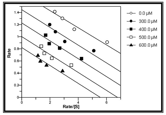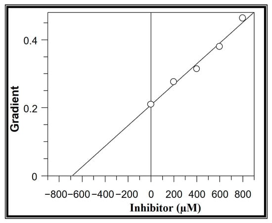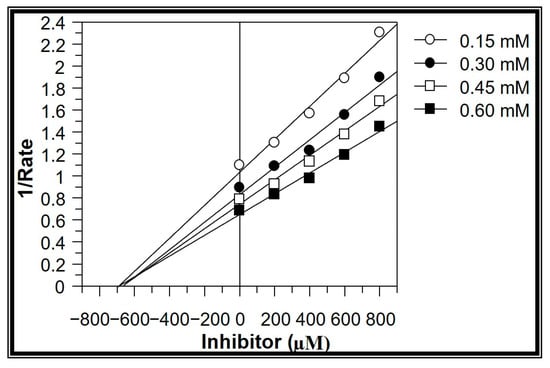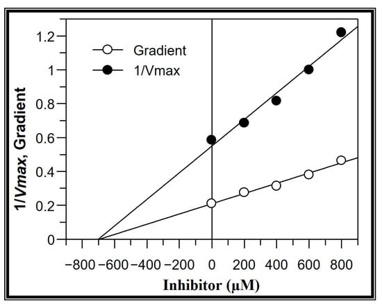 In order to determine the type of inhibition, two different methods were applied to monitor the effect of the inhibitor (test sample) on both Km and Vmax values (Figure 1, Figure 2, Figure 3, Figure 4, Figure 5 and Figure 6). First, the reciprocal of the rate of the reactions was plotted against the reciprocal of the substrate concentrations using the Lineweaver–Burk plot, and second, using the Dixon plot, in which the reciprocal of the rate of the reactions was plotted against the inhibitor concentrations [33,34]. In the case of the non-competitive and linear mixed-type inhibitions, the slope of each line of the inhibitor concentrations on the Lineweaver–Burk plot was plotted against the inhibitor concentrations. The secondary replot of the Dixon plot was constructed as the slope of each line of the substrate concentration in the original Dixon plot against the reciprocals of the substrate concentrations. The Ki values (the dissociation constant of the dissociation of the enzyme–inhibitor complex into free enzyme and inhibitor) were determined by the interpretation of the Dixon plot, Lineweaver–Burk plot, and the secondary replots using initial velocities.