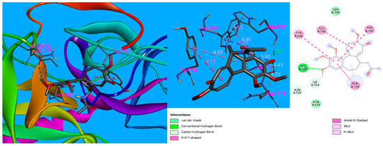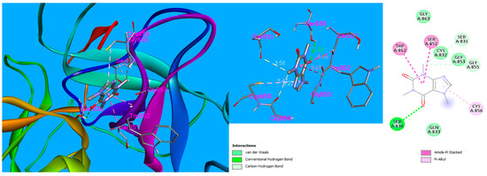 The colchicine compound (1) showed interactions with His682 through hydrogen bond interactions, with a distance of 1.96 Å, while weak interactions (pi-alkyl or pi-pi) were observed with Trp780, Gly781, Tyr681, and Tyr790, having distances of 3.59 Å, 5.55 Å, and 4.98 Å, respectively (Figure 11). Purified compound 2 also showed different interactions with different amino acids residues located on the surface of the targeted enzyme (Figure 12). The ketonic oxygen of compound 2 demonstrated hydrogen bond interactions with Ser836 (2.92 Å), while weak interaction in the form of Van der Wall were observed with Gly855, Cys856, and Ser831, with distances of 3.22,5.47, and 3.58, respectively, as shown in Figure 12. Similarly, π-alkyl interaction with Gly853 (3.97 Å) and with Ser851 (4.49 Å) were shown by compound 2, as presented in Figure 12. These results suggest that purified compounds have the ability to bind with different amino acids on the active part of the protease and can inhibit the activity of the enzyme, which is necessary for the cure of various diseases caused by the overactivity of this enzyme.
