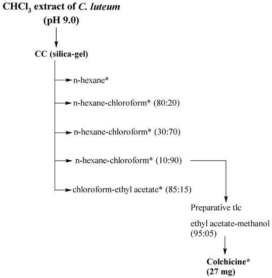 Colchicium luteum (the whole plant) was collected from hilly areas of Pakistan and identified at the Department of Botany, GC University, Lahore (GCU-BOT-083). The plant material (450 gm) was soaked in ethanol at room temperature for seven days and after that it was filtered and solvent was evaporated at reduced pressure using rotary evaporator yielding crude extract (2.1 gm). The crude extract was dissolved in water and subjected to partition chromatography with n-hexane and chloroform at pH 7.0, 3.0, and 9.0, according to Scheme S1 [5,25].