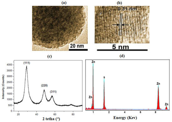 TEM images (a,b), DRX (c), and EDAX spectra (d) of ZnS nanoparticles.