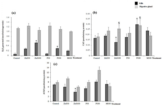 Antioxidant and neurotoxic effects of ZnS NPs and P: (a) hydrogen peroxide (H2O2) (b) CAT and (c) AChE in the gills and digestive glands of Ruditapes decussatus clams when exposed to increasing concentrations of ZnS NPs and P over 10 days. Values are the mean ± SD. (*) indicates significant differences (p < 0.05) and ($) indicates significant differences in digestive gland (p < 0.05).