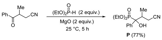 Diethyl (3-cyano-1-hydroxy-2-methyl-1-phenyl propyl)phosphonate (P) was synthesized in 77% yield, according to the procedure reported by Aouani et al. [22], which involves the reaction of 3-methyl-4-oxo-4-phenyl-butane nitrile with diethylphosphite at room temperature for 5 h in the presence of magnesium oxide as solid support (Scheme 1).