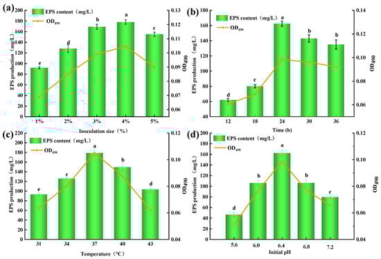 Effect of culture conditions on the EPS production from Lp. plantarum MC5. (a): Effect of inoculation size on the EPS production from Lp. plantarum MC5; (b): Effect of culture time on the EPS production from Lp. plantarum MC5; (c): Effect of culture temperature on the EPS production from Lp. plantarum MC5; (d): Effect of initial pH on the EPS production from Lp. plantarum MC5. Error bars are represented the standard errors (se) of the mean value (n = 3). “a, b, c, d, e” indicate significant differences (p < 0.05).