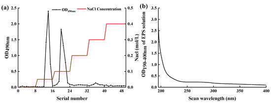 DEAE Sepharose Fast Flow elution curve of EPS-MC5 (a) and UV full wavelength scan of EPS-MC5 eluent (b). Data are represented as the mean values (n = 3).