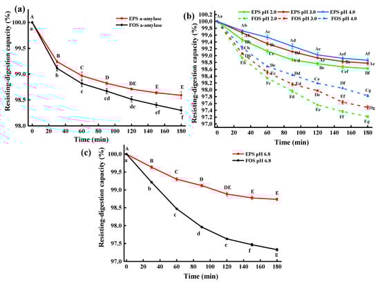 The resisting-digestion capacity (RC) of EPS-MC5 was significantly higher than that of FOS in simulated gastrointestinal juices at different pH values (p < 0.05), indicating that EPS-MC5 had a higher anti-digestive ability (Figure 5b,c). Within 0–120 min, the RC of EPS in four different pH simulated gastrointestinal juices decreased significantly (p < 0.05), while in 120–180 min, the RC decreased insignificantly (p > 0.05). In addition, the RC of the EPS-MC5 in the simulated gastric juice at pH 2.0 was significantly lower than those in pH 3.0 and pH 4.0 (p < 0.05). The results showed that the RC was inversely proportional to pH, with more glycosidic bonds cleavage at low pH. This may be due to that pH affected the RC of EPS by adjusting the enzymatic activity in simulated gastric juice.