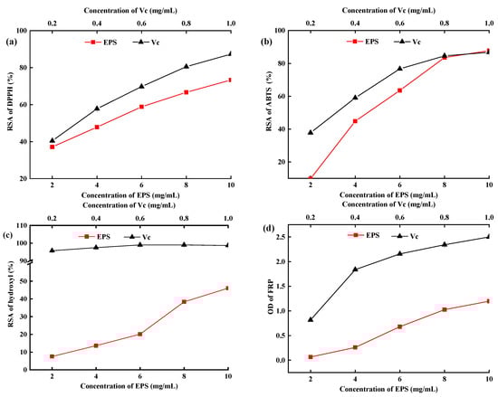 The in vitro radical scavenging rate of EPS is a common method to evaluate the ability and mechanisms of antioxidants [33]. DPPH· is a stable radical with an unpaired electron on one atom of its nitrogen bridge and has a strong absorption band at approximately 517 nm [27,34]. Hydroxyl radical (•OH) has free access to cell membranes and causes tissue damage. Thus, scavenging ·OH may avoid tissue injury [4,35]. The DPPH·, ABTS·, and •OH RSR of the EPS and Vc significantly increased with increasing concentrations (p < 0.05, Figure 6a–c). The RSR (DPPH•, ABTS•, and •OH) of EPS increased from 37.12% to 73.33%, 9% to 87.74%, and 7.53% to 46.07% at 2–10 mg/mL concentrations. Miao et al. [36] reported that the RSR of DPPH· was 40% for EPS at 5.0 mg/mL, which supported the results of this study. Results showed that the RSR of DPPH· and ABTS· was higher than that of OH.