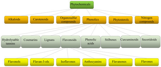 Plants produce a variety of structurally diverse and often complex secondary metabolites (SM) with a range of biological functions [1]. Plant SM can be classified according to several criteria, such as chemical structure (presence of rings or sugars), composition (containing nitrogen or not), solubility in organic solvents or water, and the biosynthetic pathway [2]. They include alkaloids, carotenoids, organosulfur compounds, phytosterols, nitrogen compounds, and phenolics (Figure 1).