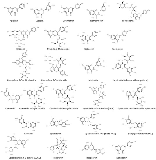 Chemical structure of the selected flavonoids (from ChemSpider, http://www.chemspider.com/ accessed on 24 February 2023).