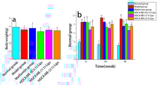 The body weight of mice from six groups showed no significant difference after 21 days of administration (Figure 1a). The metformin group significantly reduced the food intake of type 2 diabetic mice after 2 weeks of treatment (p < 0.01) (Figure 1b). After 3 weeks of administration, the food intake of the three liposome groups decreased significantly when compared with the model group. It was observed that a slight decrease in food intake in the HDCA:ME-(0.5:1)-Lips group after the treatment of 3 weeks. However, there was no significant difference between the HDCA:ME-(1:1)-Lips and HDCA:ME-(2:1)-Lips groups.