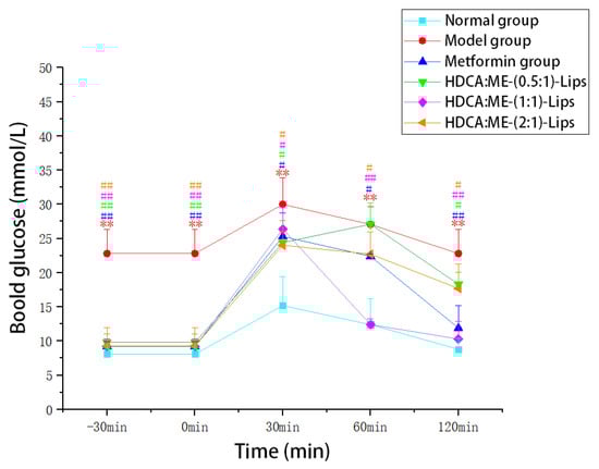 The results demonstrated that the blood glucose levels of all the mice increased rapidly within 30 min, and then gradually decreased from 30 min to 120 min. The blood glucose levels of the model group were significantly higher than those of normal group (p < 0.05). The blood glucose levels of the liposome groups and the metformin group significantly decreased (p < 0.05) when compared with the model group. Between 30 and 120 min, the blood glucose levels of the HDCA:ME-(0.5:1)-Lips and HDCA:ME-(2:1)-Lips group were higher than those of the metformin group, while the blood glucose levels of the HDCA:ME-(1:1)-Lips group were lower than those of the metformin group. The efficacy of the HDCA:ME-(1:1)-Lips group was slightly better than the metformin group. In three liposome groups, the time of effect in the HDCA:ME-(1:1)-Lips group was significantly faster than those in HDCA:ME-(0.5:1)-Lips and HDCA:ME-(2:1)-Lips group. The analysis of blood glucose at different time intervals, indicated that the improvement effect of HDCA:ME-(1:1)-Lips on glucose tolerance was significantly higher than that of metformin in type 2 diabetic mice. Furthermore, a flattening hypoglycemic trend of the HDCA:ME-(1:1)-Lips group was observed between 90 and 120 min, revealing that HDCA:ME-(1:1)-Lips group demonstrated a certain sustained-release effect.