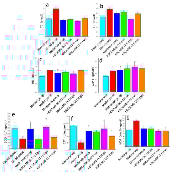 Total cholesterol (TC) and triglyceride (TG) are important clinical indicators of blood lipid [24]. The pathological elevation of TC increases the risk of hyperlipoproteinemia, atherosclerosis, and diabetes [25]. High levels of TG can lead to atherosclerosis, diabetes, and pancreatitis [26]. As shown in Figure 3a,b, the TC and TG of the model group were higher than those of the normal group (p < 0.05). The high levels of TC and TG were reduced in the metformin group and the liposome groups (p < 0.05). The TC levels in the HDCA:ME-(1:1)-Lips group were higher than those in the HDCA:ME-(0.5:1)-Lips and HDCA:ME-(2:1)-Lips groups. The TG levels in the three HDCA-ME-Lips groups were higher than those in the metformin group. Thus, HDCA:ME-(1:1)-Lips group performed the best.