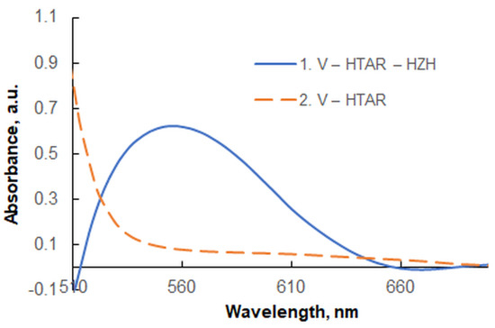 | HTAR + V(V) | 554 | Up to 12.2 | 3.50 × 104 | 0.13 | A sensitive, fast, and robust extraction–spectrophotometric procedure based on a ternary ion-association complex | This work |