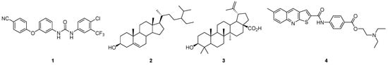 The reported molecules with SHP1-activating effects mainly include diphenyl urea [,,,], steroid [,,,,,], pentacyclic triterpenoid [,,], and indole scaffolds [,,,,] (Figure 1). SC-43 (1) enhanced SHP1 activity to inactivate STAT3, thereby inhibiting the proliferation of hepatocellular carcinoma and colorectal cancer cells [,]. β-Sitosterol (2) elevated SHP1 activity, suppressing the subsequent nuclear factor kappa-B (NF-κB) and signal transducer and activator of transcription 1 (STAT1) signaling pathways to exert anti-inflammatory effects []. SHP1 activated by betulinic acid (3) induced apoptosis and enhanced the cytotoxic effects of chemotherapeutic agents in multiple myeloma cells via suppressing the STAT3 signaling pathway []. Thieno [2,3-b]quinoline-procaine hybrid 4 can directly activate SHP1 and inhibit activated B-cell-like diffuse large B-cell lymphoma (ABC-DLBCL) cell proliferation via blocking the STAT3 pathway []. However, most of the molecules described above have been identified as inhibitors for other targets. There are still few studies on selective SHP1 activators, which limits the investigations of SHP1 as a pharmacological target for cancer treatment.