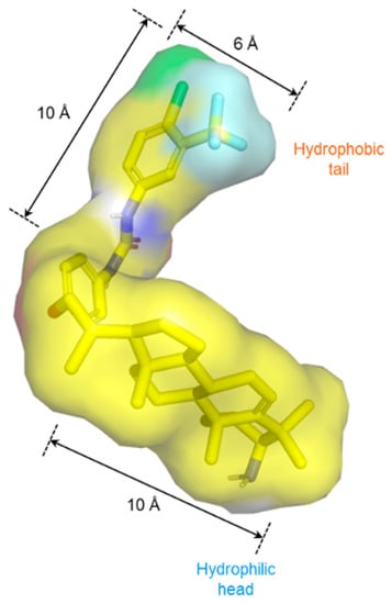 The binding pocket is mainly composed of a hydrophobic pocket and a hydrophilic pocket (Figure 3). The narrow hydrophobic pocket is made up of Val2, Trp4, Phe27, and Val76, with Met1 as gatekeeper. The depth of the hydrophobic pocket is approximately 10 Å, and the width is approximately 6 Å. Four hydrophilic residues, namely Arg217, Asp481, Asp483, and Lys486, embrace the larger hydrophilic pocket from one side. The hydrophilic pocket provides the interaction between the protein and the amino head of the compound. Compound 5ba possesses an L-shaped structure, and the phenyl urea tail fits well in the hydrophobic pocket (Figure 4).