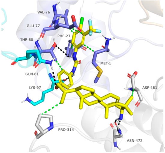 As shown in Figure 5, the 4-chloro-3-(trifluoromethyl)phenyl ring occupies the hydrophobic pocket through hydrophobic interactions with Met1, Phe27, Val76, and Glu77. The urea group of 5ba forms two hydrogen bonds with Thr80 (3.7 Å) and Lys97 (2.9 Å), which could explain why the potency of 5ba increased ∼23 times than 5aw. The phenoxy group forms a hydrogen bond with Gln81 (3.1 Å) and forms a hydrophobic interaction with Thr80. The 3-amino group of the steroid parent nucleus creates two hydrogen bonds with Asn472 (1.9, 2.9 Å), which accounts for the potency of the series of newly synthesized compounds. The C-4 methyl group forms a hydrophobic interaction with Asp481. The C-21 methyl group forms a hydrophobic interaction with Pro314.