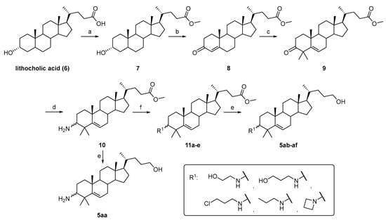 We initiated our efforts by investigating C-3 substituents. Usually, compounds containing the aliphatic –NH– group have better water solubility and stronger hydrogen-bonding ability. We replaced the C-3 hydroxyl group with an amino group to afford the compounds 5aa-af (Scheme 1). Lithocholic acid (6) was subjected to esterification and oxidation via a combination of 2-iodoxybenzoic acid (IBX) and trifluoroacetic acid to afford α,β-unsaturated ketone compound 8. Compound 9 was obtained by C-4 methylation accompanied by a rearrangement of the double bond. Reductive amination of the C-3 carbonyl group afforded compound 10. Compound 5aa was prepared by reducing the C-24 carboxylate group of compound 10. The N-alkylation of compound 10 and the subsequent LiAlH4 reduction formed compounds 5ab-af.