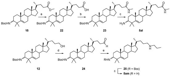 In addition, we replaced the hydroxyl group at C-24 with amide or amine to form compounds 5al-am (Scheme 4). Compound 15 was hydrolyzed into carboxylic acid 22, which then reacted with methylamine hydrochloride in the presence of N-(3-dimethylaminopropyl)-N’-ethylcarbodiimide hydrochloride (EDCI) to afford amide 23. Compound 5al was finally produced through deprotection. Compound 12 was transformed into aldehyde 24 by IBX oxidation. The subsequent reductive amination of 24 with n-propylamine and C-3 deprotection resulted in compound 5am.