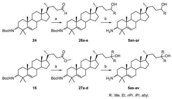 We envisioned that the introduction of secondary/tertiary alcohol groups into the side chain would probably increase the activity. The compounds 5an-av were designed and synthesized, as described in Scheme 5. The treatment of compounds 24 and 15 with Grignard reagents, followed by C-3 deprotection, furnished compounds 5an-av.