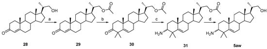 To verify the influence of changing the side chain length on a compound’s biological activity, we removed two ethylene spacers between the hydroxyl group and the remainder of the scaffold to design compound 5aw (Scheme 6). Commercially available 21-hydroxy-20-methylpregn-4-en-3- one (28) was initially protected with an Ac- group, methylated with KOtBu and MeI to furnish compound 30. The following reductive amination and C-22 deprotection resulted in compound 5aw.