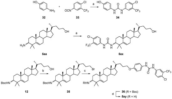 Urea exhibits unique hydrogen-binding capabilities and becomes an important functional group for drug–target interactions. We employed the rational design strategy of incorporating a diphenyl urea active substructure into the steroids to obtain the merged structures 5ax-ba. The syntheses of compounds 5ax-ba are outlined in Scheme 7 and Scheme 8. Treating compound 32 with isocyanate compound 33 produced diphenyl urea intermediate 34. Compound 5ax was made in one step from compounds 5aa and 34 in the presence of Et3N. Compound 12 underwent C-24 bromination, coupling with compound 35, and then deprotection to generate compound 5ay.