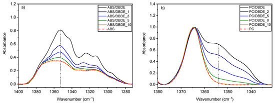 The bands at 966 cm−1 and 911 cm−1, attributed to the vinyl stretching of the butadiene component, can be regarded as the most fragile part of the ABS chain [42]. The band at 966 cm−1 showed a rather linear decrease as a function of irradiation time; however, this was small when compared to the decrease in the 1350 cm−1 band, which stabilized after a certain irradiation time as can be observed in Figure 3. It should be mentioned that the absorbance at 1350 cm−1 was not expected to fall below a certain value in the irradiated ABS/DBDE blends since the virgin ABS presents a specific absorbance around this wavenumber as can be seen in Figure 2a. In the case of the PC (Figure 2b), the disappearance of the shoulder at 1350 cm−1 was rather complete after 10 min of exposure time with no visible change in the other bands.