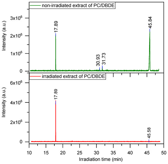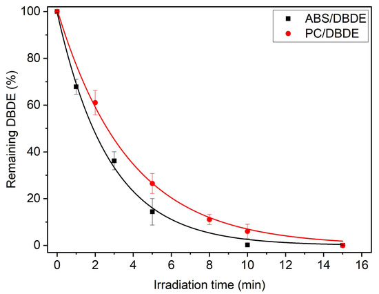 The kinetics of photodegradation of DBDE was followed by GC/MS after ultrasound assisted extraction and purification of the extracts. The extracts from the non-irradiated (90 wt-% ABS/10 wt-% DBDE) and (90 wt-% PC/10 wt-% DBDE) contain predominantly DBDE and traces of different isomers of Nona-BDE (impurities present in the commercial DBDE), which mostly disappeared after irradiation as can be observed in the chromatograms presented in Figure 4. The fixed concentration of the external standard allowed to quantify the amount of the remaining DBDE using a calibration curve. The photodegradation profiles of DBDE, presented in Figure 5, exhibit exponential decays obeying the pseudo-first order reaction rate. The reaction generates lower brominated congeners, in accordance with the widely reported stepwise debromination mechanism, following the cleavage of the C-Br bond [32,34]. The photodegradation reaction rates of DBDE, averaged over at least four experiments, were slightly higher in ABS than in PC. Indeed, the rate constants were 0.36 min−1 and 0.27 min−1 for ABS and PC, respectively.