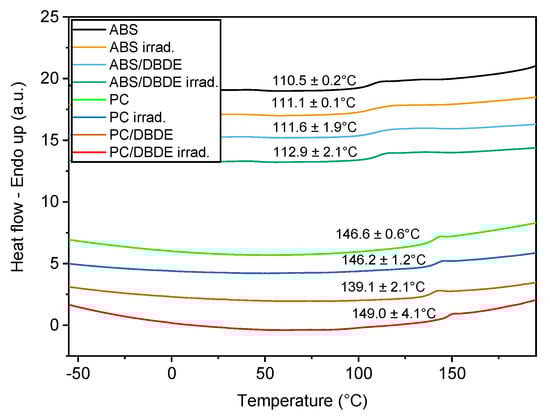 The DSC measurements were conducted on virgin and irradiated ABS, 90 wt-% ABS/10 wt-% DBDE, PC, and 90 wt-% PC/10 wt-% DBDE samples. As expected, a single glass transition temperature (Tg) was observed for each case, in the whole temperature range investigated (Figure 7). Interestingly, the addition of DBDE to the virgin polymer as well as the irradiation of these samples did not modify substantially the glass transition for a given polymer. Only the irradiated 90 wt-% PC/10 wt-% DBDE sample presented a considerable increase in the Tg as illustrated in Figure 7. Indeed, the averaged measured Tg of the latter sample exceeded the Tg of the virgin 90 wt-% PC/10 wt-% DBDE by 9 °C, which might be explained by the polymeric crosslinking effects [46].