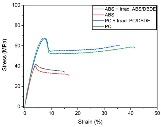 The mechanical properties of the UV-visible light exposed polymers are expected to be significantly affected by the irradiation process [48]. Consequently, small quantities of the irradiated polymer/DBDE mixtures were incorporated into the virgin polymers in order to valorize these new decontaminated materials. Figure 8 presents a comparison of the averaged stress-strain curves of the virgin ABS and PC, as well as the following blends: “90 wt-% ABS + 10 wt-% of irradiated (90 wt-% ABS/10 wt-% DBDE)” and “90 wt-% PC + 10 wt-% of irradiated (90 wt-% PC/10 wt-% DBDE)”. Table 1 summarizes the data obtained from the static mechanical analysis.