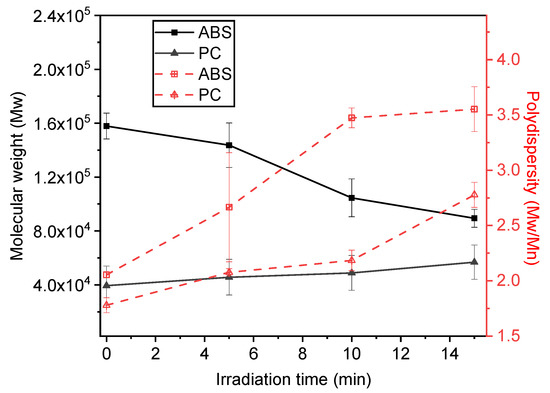 An overall increase in the polydispersity, expressed by Mw/Mn, was observed for both polymers as shown in Figure 9, with a pronounced effect for ABS when compared to PC. Mw and Mn represent the weight and number averages of the molecular weight, respectively. The molecular weight of PC did not change significantly when increasing the exposure time to UV-visible light, indicating that PC presents a good stability towards the irradiation effects. On the other hand, ABS showed a strong decrease in the molecular weight when increasing the irradiation time; i.e., from Mw = 1.6 × 105 g/mol for the virgin polymer to 9 × 104 g/mol for the sample irradiated for 15 min. Such behavior has already been reported in the literature in relation to the chain scission effects of the irradiated polymers [36,41,48]. Going along these lines, it should be mentioned that ABS becomes increasingly insoluble in the THF with light exposure time, indicating the presence of both cross-linking and chain scission effects (see also Figure 6a). The total insoluble fraction corresponds roughly to 20% for ABS for an irradiation time of 15 min, whereas in the case of PC, the insoluble fraction is represented by under 5% for the same light exposure time.