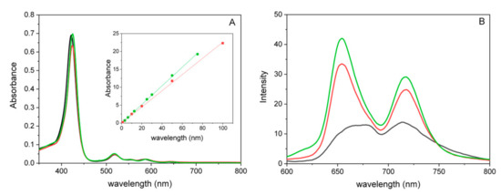 UV/Vis (A) and steady-state emission (B) spectra of (CAPTISOL®/TMPyP)50_1 (green line), CAPTISOL®/TMPyP (red line) and free TMPyP (black line) in ultrapure water (λexc = 448 nm). Shown in the inset is the determination of molar extinction coefficients, by the Lambert–Beer law, of (CAPTISOL®/TMPyP)50_1 (green circles) at λ = 425 nm (ε = 2.59 × 105 ± 2610 M−1 cm−1, R2 = 0.999) and CAPTISOL®/TMPyP (red squares) at λ = 424 nm (ε= 2.26 × 105 ± 2200 M−1 cm−1, R2 = 0.999). The value of the molar extinction coefficient of free TMPyP at λ = 422 nm is 2.34 × 105 M−1 cm−1 [46]. Free TMPyP equaled a concentration of 3 µM. [TMPyP] equaled 2.8 µM within the CAPTISOL®/TMPyP and (CAPTISOL®/TMPyP)50_1 nanoassemblies, respectively.