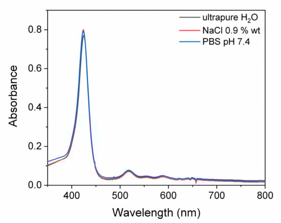 Stability studies in biologically relevant media were carried out to elucidate the behavior of nanoassemblies in conditions mimicking the bacterial inactivation experiments. Figure 3 showed UV/Vis spectra in ultrapure water, 0.9 wt% NaCl aqueous solution and PBS. No significant spectroscopic changes were observed.