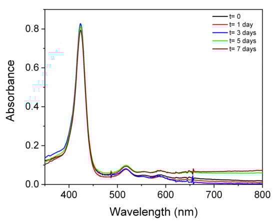Furthermore, UV/Vis spectra were acquired after the storage of dispersions of (CAPTISOL®/TMPyP)50_1 in PBS at 37 °C for 7 days (Figure 4), as well as those in ultrapure water and NaCl 0.9% wt (Figure S1). Analogous UV/Vis spectra were visualized following the storage of (CAPTISOL®/TMPyP)50_1 nanoassembly dispersions at 4 °C in the same media (Figure S2).