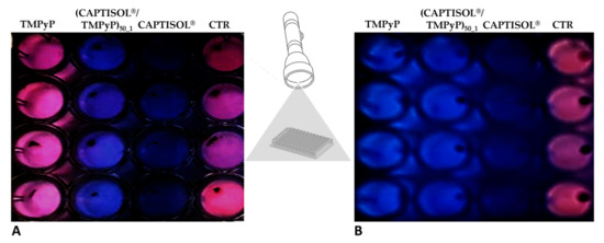 Figure 5 shows the presence of a bright green color in the control samples and in those containing TMPyP, indicating the production of PYO. Otherwise, the intensity of green lowers to different extent in the conditions with (CAPTISOL®/TMPyP)50_1 and CAPTISOL® alone (at a concentration of 600 µM). By reversing the color and contrast enhancement of the picture (Figure 5), it is possible to better visualize the wells in which PYO is present (pink wells). In addition, it is possible to detect the presence of TMPyP, which appears blue, while wells in which there is neither pyocyanin production nor the presence of TMPyP appear dark (condition containing CAPTISOL® alone). When the same wells were exposed to a white LED source (total fluence 54.82 J/cm2), color changes associated with the photooxidation of PYO were observed in the wells with TMPyP and CAPTISOL®/TMPyP (Figure 6). Specifically, these wells appeared blue, due to presence of TMPyP alone or it being complexed with CAPTISOL®.