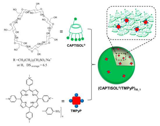 CAPTISOL®/TMPyP nanoassemblies at a 50:1 molar ratio ((CAPTISOL®/TMPyP)50_1 Scheme 1) were prepared with high entrapment efficiency (about 100%) in an aqueous solution, simply by adding a proper amount of porphyrin to an aqueous solution of CAPTISOL®, following a well-established procedure (see Section 3 Methods and Materials).
