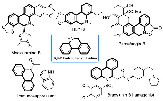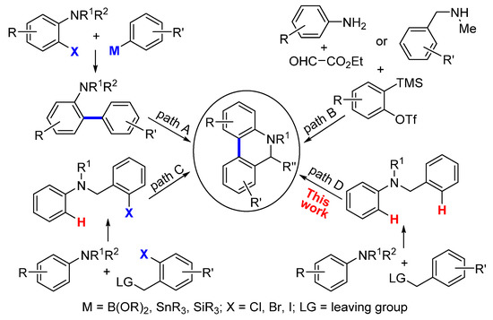 - Asamdi, M.; Chauhan, P.M.; Patel, J.J.; Chikhalia, K.H. Palladium catalyzed annulation of benzylamines and arynes via C-H activation to construct 5,6-dihydrophenanthridine derivatives. Tetrahedron 2019, 75, 3485–3494. [Google Scholar] [CrossRef]