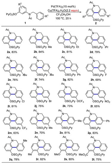 We commenced this research by investigating the phenol-protecting group, which had the potential directing feature for the ortho-functionalization of arenes. A series of phenol-protecting groups were tested with 10 mol% Pd(OAc)2 as the catalyst and acetyl as the protecting group of the nitrogen atom in dimethyl sulfoxide (DMSO) under an air atmosphere (Table 1). The reaction did not occur without the phenol-protecting group (entry 1). The protecting groups CONMe2 and O-(2-pyridyl)carbonyl are excellent directing groups in many C-H functionalization reactions of arenes, but they almost did not work in this reaction (entries 2 and 3). Gratifyingly, when the O-(2-pyridyl)sulfonyl group was used as the protecting group, the desired aryl C−H/C−H coupling product 2a was generated with a 9% yield (entry 4). The structure of 2a was confirmed by single-crystal X-ray diffraction. We considered that the reactivity of the O-(2-pyridyl)-sulfonyl group should lie in it being not only a great directing group but also a good activating group to facilitate the formation of a phenyl−Pd complex through the ortho C−H bond activation of phenol [47,48]. Encouraged by the preliminary result, we then carefully examined other parameters of the reaction. The influence of the solvent showed that CF3CH2OH was the best option, providing 2a with a 12% yield (entries 5–7). After screening the oxidant, copper(II) trifluoroacetate hydrate provided the highest yield (31%, entries 8–12). Note that without any oxidant the reaction gave 2a with a 8% yield under an argon atmosphere (entry 13). Next, the reaction temperature was checked (entries 14–17). Increasing the temperature benefitted the reaction, and the yield was increased to 45% at 100 °C. It turned out that the N-protecting group was crucial for this reaction. As speculated, the replacement of the N-protecting group with Ts, Boc, methyl, or phenyl all led to inferior results (entries 18–21). Then, the palladium source was investigated, indicating that Pd(TFA)2 was the best catalyst (entries 22–25). The investigation of the amount of Pd(TFA)2 and Cu(TFA)2·H2O indicated that Pd(TFA)2 (15 mol%) and Cu(TFA)2·H2O (2.2 equiv.) were the best choices (entries 26–31). It is noteworthy that the reaction proceeded similarly under an argon atmosphere (entry 31). Accordingly, the optimized reaction conditions were identified as the following: Pd(TFA)2 (15 mol%) and Cu(TFA)2·H2O (2.2 equiv.) in CF3CH2OH at 100 °C under an air atmosphere for 20 h (entry 29).