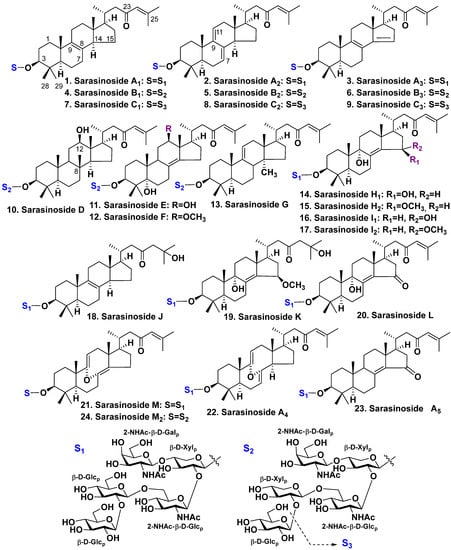 The glycosides of Melophlus sarasinorum form a mixture of 14-nor-methyl-lanostane (or 30-norlanostane) derivatives. Nine glycosides, sarasinosides A1–A3 (1–3), B1–B3 (4–6), and C1–C3 (7–9), were firstly found by Kitagawa et al. [21,24] from specimens collected in shallow waters of the Palauan Archipelago. Sarasinoside A1 (1) was also found by Schmitz et al. [22] from the sponges harvested near Guam Island and Truk Lagoon. Other similar glycosides, sarasinosides D–G (10–13), as well as known sarasinoside B1 (4), were found by Espada et al. in the same species harvested near Guam Island [25] (Figure 1).