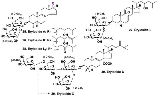 The study of marine sponges of the genus Erylus (family Geodiidae, subfamily Erylinae) began in the late 1980s of the last century and continues to the present time. These studies began with the study of the sponge Erylus lendenfeldi, which is a habitant of the Indo-West Pacific zoogeographical region. Eryloside A (25), a new bis-nor-triterpene bioside, with 4β,14-di-nor-methyl-lanostane aglycone and β-D-galactopyranose as the first sugar together with another (terminal) β-D-galactopyranose linked to C-2 of the first sugar, was found in the Red Sea sample of this sponge species by Carmely et al. in 1989 [29]. Glycoside 25 aglycone possesses 8(9)- and 14(15)-double bonds and a hydroxyl at C-23.