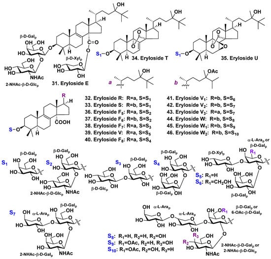In continuation of the investigation of E. goffrillery, which was harvested from the Caribbean Sea near the Arrecife-Seco reef (Cuba), Antonov et al. [35] isolated seven new tetracyclic triterpene glycosides: erylosides F8 (40), V1 (41), V2 (42), V3 (43), W (44), W1 (45), and W2 (46) (Figure 3). Erylosides 40 and 43 have 14-carboxy-24,25-dimethyllanost-8(9)-en-3β,25-diol as aglycone whereas glycosides 41, 42, and 44–46 possess 14-carboxy-24-acetoxy-24-methyllanost-8(9)-en-3β-ol as aglycone. Glycoside 40 is a bioside having β-D-galactopyranose as a first monosaccharide residue attached to C-3 of the aglycone and the same monosaccharide residue attached to C-2 of the first galactopyranose. Glycosides 41, 42, and 43 are triosides consisting of the same first sugar, with the second and third monosaccharides attached to C-2 and C-3 of the first sugar, respectively. Glycoside 41 has β-D-galactopyranose as the second sugar whereas 42 and 43 have N-acetyl-2-deoxy-2-amino-β-D-galactopyranose. Glycoside 41 has xylose as the third monosaccharide residue whereas 42 and 43 have α-L-arabinopyranose. Glycosides 44–46 are tetraosides. The first sugar of 44 is β-D-galactopyranose whereas 45 and 46 have 6-OAc-β-D-galactopyranose. Two residues of α-L-arabinopyranose, attached to each other by 1→4 glycosidic link, are linked to C-3 of the first sugar for all the tetraosides 44–46. The fourth (terminal) sugar for 44 and 45 attached to C-2 of the first monosaccharide residue is N-acetyl-2-deoxy-2-amino-β-D-galactopyranose whereas N-acetyl-2-deoxy-2-amino-β-D-glucopyranose is the fourth sugar for glycoside 46 [35].