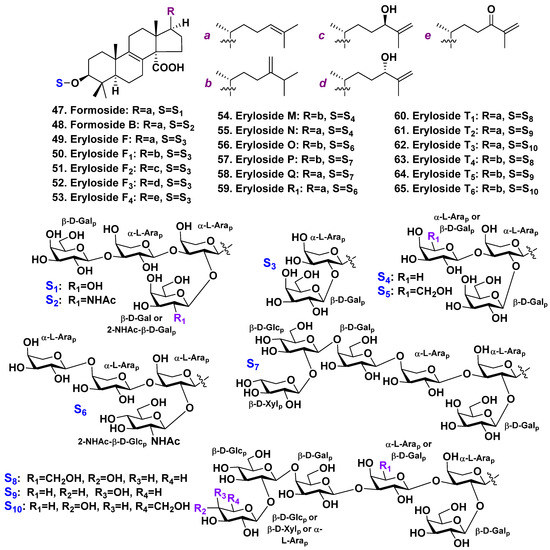 Antonov et al. continued the investigations and discovered eryloside R1 (59), a trioside, along with formoside (47) and six new hexaosides, erylosides T1–T6 (60–65) [40] (Figure 4). The sugars in all these glycosides were in β-D-pyranose forms except for L-arabinose residues, which had an α-configuration. Eryloside R1 (59) has penasterol as its aglycone. Its terminal galactose is attached to C-3 of the first sugar (arabinose), whereas another galactose residue is linked to the arabinose C-2 position. Hexaosides 60–62 also contain penasterol as the aglycone. However, hexaosides 63–65 contain an aglycone with a methylene group at C-24 in the side chains which is common in this series [40]. All the hexaosides possess carbohydrate moieties as they have the same architecture (general structural plan). Their carbohydrate chains are closed to those of erylosides P (57) and Q (58) [39].